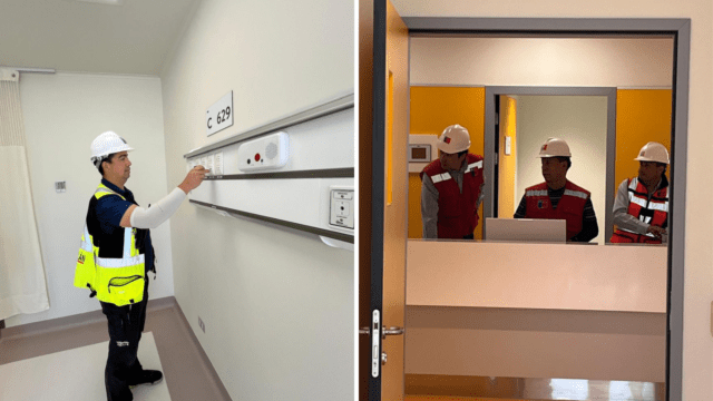 Las pruebas consideran la verificación circuito por circuito del sistema eléctrico en las unidades de hospitalizados entre el cuarto y sexto piso, el funcionamiento de enchufes, tableros y luminarias, así como la validación de puntos de datos, Wi-Fi y sistemas de llamado de enfermería. Además, se revisa el sistema de audio y voceo para pasillos, salas de espera y recintos clínicos, junto con los controles de acceso con huella y tarjetas en áreas restringidas y bodegas de equipos.